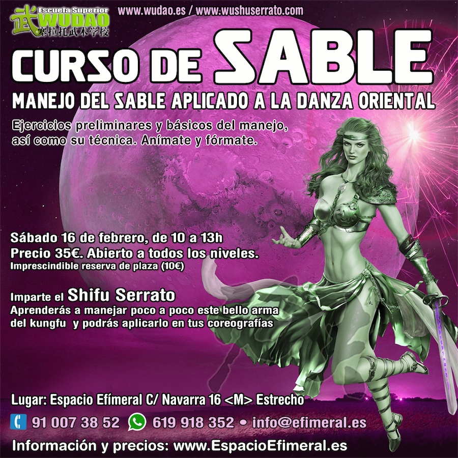 Leena Qadi, profesora de danza del vientre con más de 15 años de experiencia, organiza este curso indispensable de sable para todas aquellas bailarinas que quieran enriquecer su danza, con el director de la Escuela Superior Wudao en Madrid: Shifu Serrato.