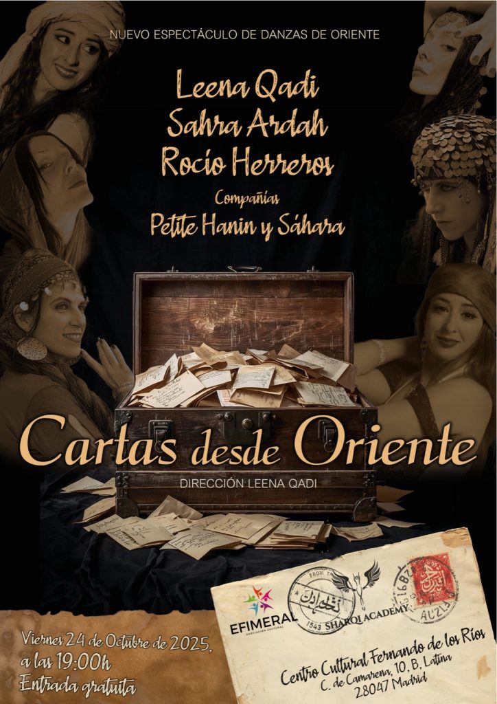 Cartas desde Oriente es un espectáculo que recorre paisajes reales e imaginarios a través de la mirada femenina. Desde la majestuosidad del antiguo Egipto, pasando por los aromas de Persia, el fuego gitano, las místicas danzas sufíes, hasta el colorido sueño de la India: cada escena es una carta abierta, una confidencia coreográfica escrita desde el alma.